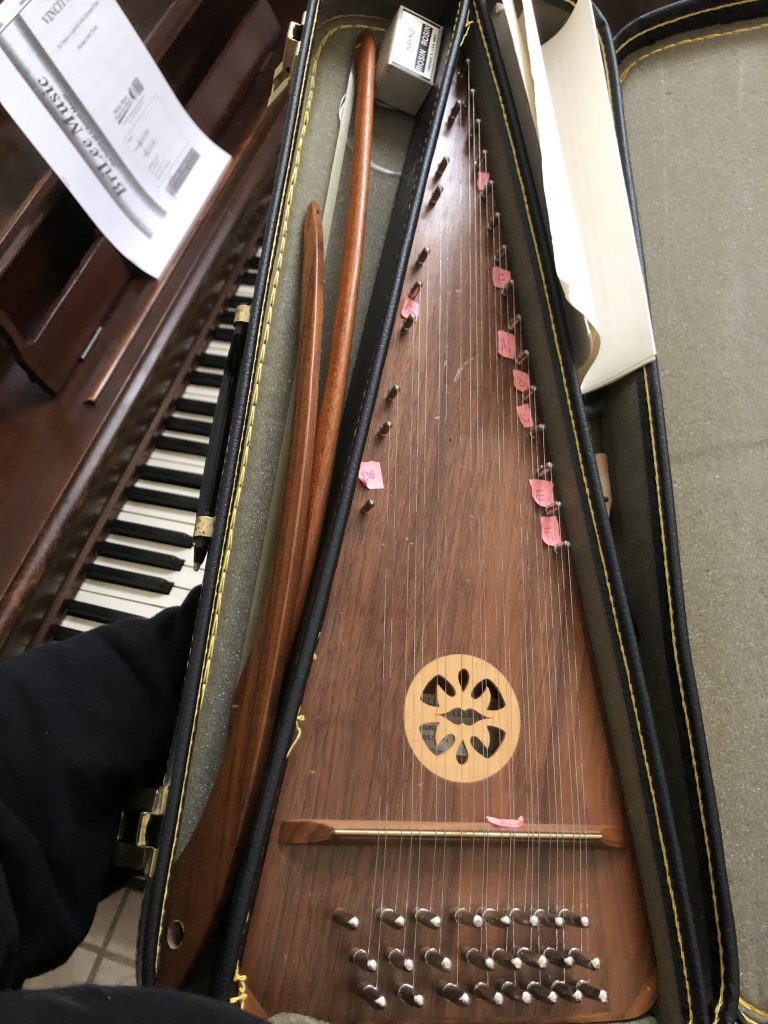 The instrument featured in this very unprofessional photo here is a bowed psaltery. It was my grandmother’s and was given to me when she passed away. I need the bow re-strung. As you can see, I put little stickies to help me learn the notes. I know how to play a little bit of “Ode to Joy” on it, but that’s it. I haven’t spent much time on it, but I’d love to eventually. (You can watch/listen to someone playing one here if you’re curious). It spends it’s days sitting in it’s case on display on top of the next instrument on the list…