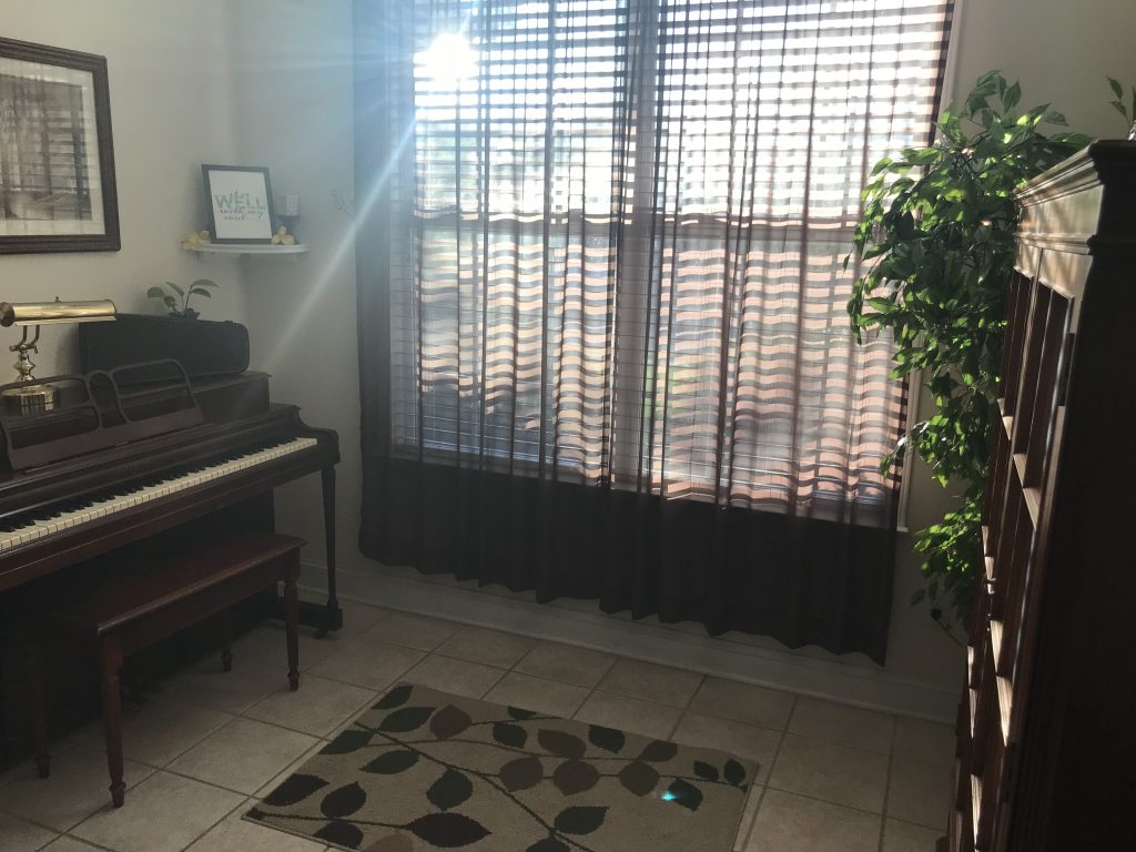 My mother’s piano. This is the piano I learned to play on through elementary and middle school and maybe into high school – I don’t remember when I stopped taking lessons. Unfortunately, when I stopped taking lessons, I also stopped playing with the exception of Pachelbel’s Canon in D which I had memorized and kept flowing from my fingers for a while after I stopped learning new music on the piano. This is also the place my mother played and learned and practiced new choral music. It has been moved 3 times and hasn’t been tuned. (You may be seeing a pattern here that I am not the best at musical instrument upkeep). It lives in what we call the “reading room” because the room has one big chair and a large bookcase. The brass lamp has always lived on top of the piano and it gets really hot if you leave it on for too long. The bench is full of piano lesson books and choral music.